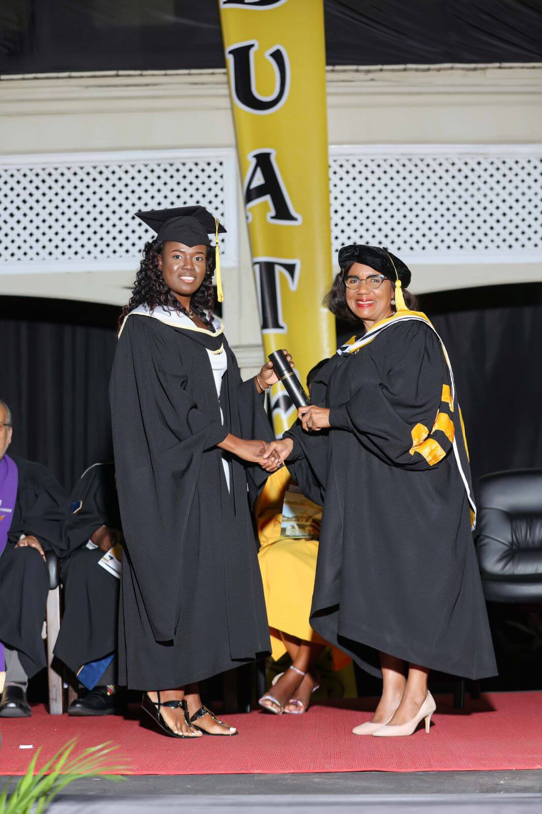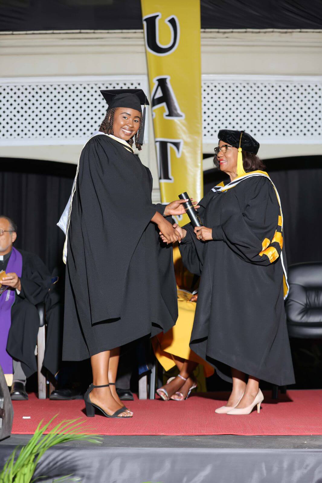 The academic dress for graduands of The Mico University College includes the University Gown with appropriate Faculty Hood and Mortar Board.